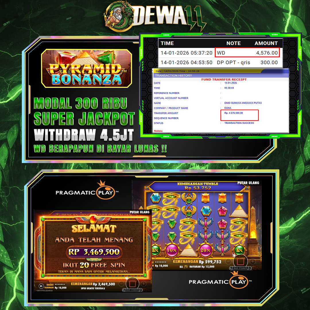 DEWA11 menghadirkan game jackpot vip yang di lengkapi fitur khusus new member hanya dengan modal deposit 300k dijamin akan withdraw 4,5+ juta malam ini.
